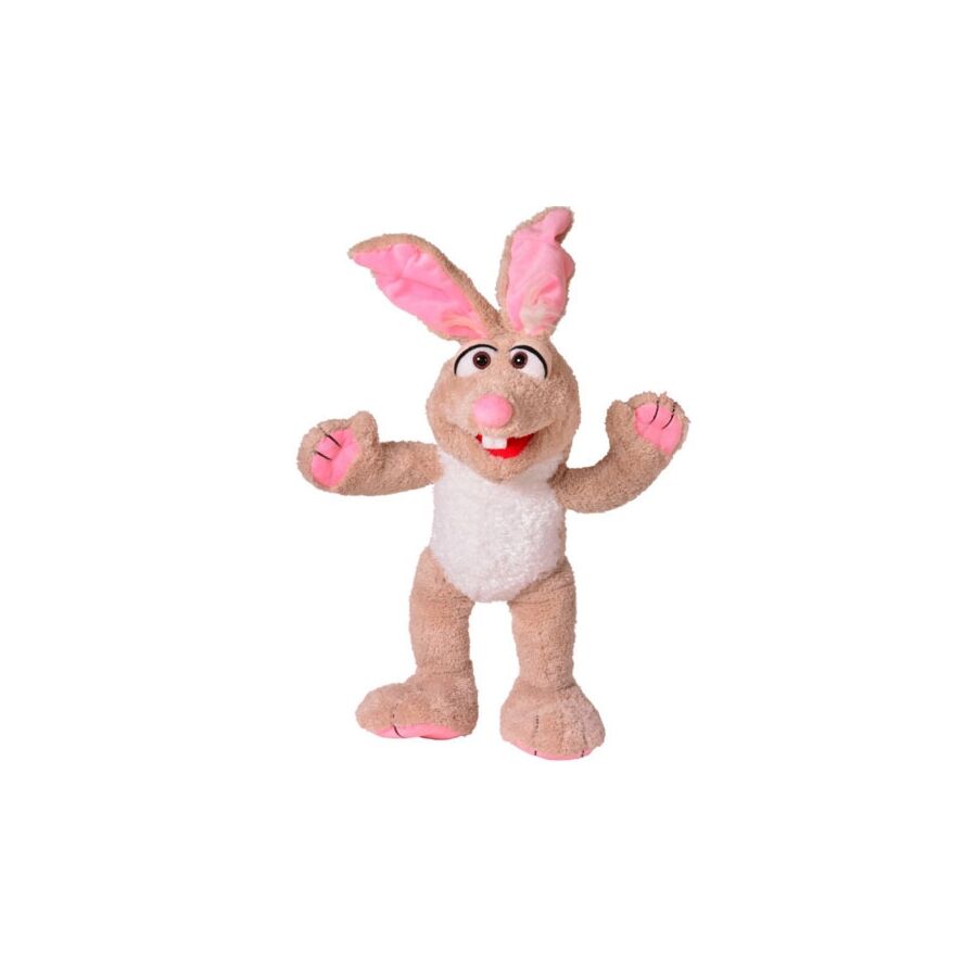 Deze handpop van Konijn Hironimus Muffelfuss is 62 cm groot. Hironimus is het snelste konijn van de wereld... maar hij is ook recordhouder in vermoeid zijn en in slaap vallen! Je kan de kop en de mond van de handpop bespelen.