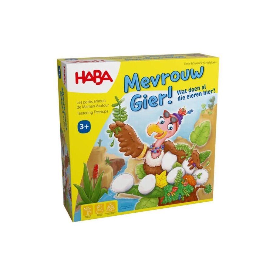 Mevrouw Gier is opgewonden. Ze heeft maar liefst 8 eieren gelegd. Helaas is haar nest te klein. Bouw samen een stabiel nest voor haar. Pas hierbij op voor brutale papegaaien die ook een plekje in het nest willen. De dobbelsteen bepaalt wat je in het nest mag leggen.