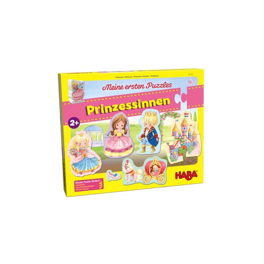 Mijn eerste puzzels: Prinsessen bestaat uit 5 puzzels, 2 van 2 stukken, 2 van 3 stukken en 1 van 4 puzzelstukken. De puzzels bevatten zeer mooie sprookjesfiguren en objecten.