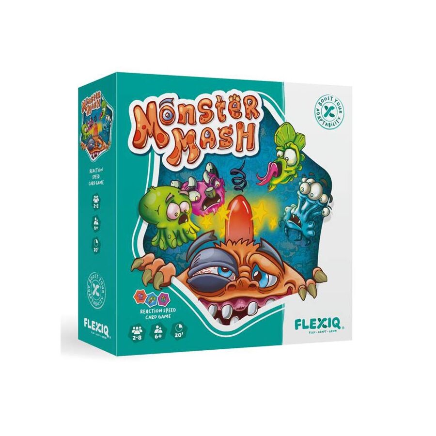 Monster Mash is een leuk reactiespel voor twee tot acht spelers. De spelers gaan op zoek naar gelijke kenmerken op monsterkaarten. Vinden ze een juiste combinatie van 3x hetzelfde monster, 3x dezelfde monsterkleur of 3x dezelfde achtergrondkleur, dan meppen ze op het oranje monster. De eerste speler verbant drie monsters naar het land van een tegenstander.