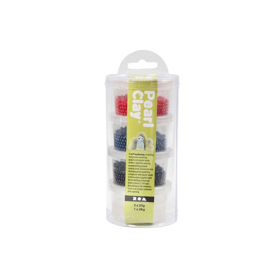Een Pearl Clay set bestaat uit 3 potjes met plastic kralen (elk 25g) en een potje gel (38g). De gel is een modeleermassa met lijm die je mengt met de kralen. De gel wordt transparant als hij droog is. Deze set bevat donkerblauwe, rode en zwarte kralen.