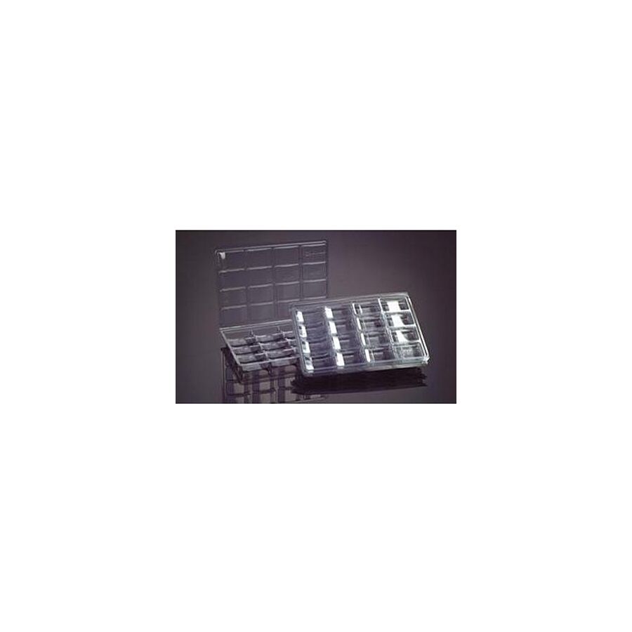 This Counter Tray is 8" x 11" and will fit inside an Avalon Hill-sized box It is 3/4" deep, stacks very well (only adds 1/2" to height when stacked), and holds about 1000 counters. The 16 compartments measure 2.25" x 1.5" x 0.5" and are short enough so they counters will not flip over while being stored. The tray does not open easily so as to avoid unwanted opening if the tray is dropped while holding lots of counters The hinge is made so that the tray lays flat when open, preventing unwanted launchings if pressed in the middle. The curved bottom of the tray allows for easy removal of counters as they slide out and don't get caught in the corners. The molding between compartments makes for a much stiffer tray when full of counters.
