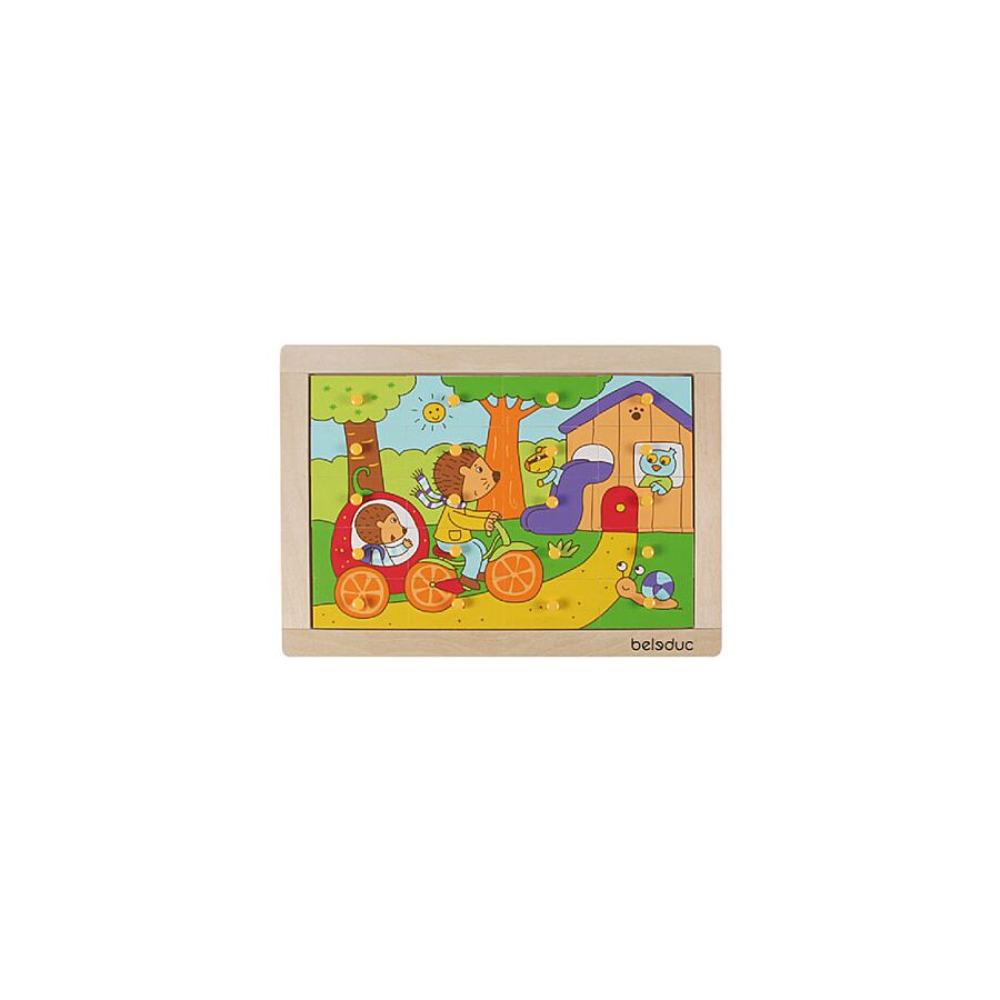Puzzel Egel is te maken in drie moeilijkheidsgraden: met een gekleurd voorbeeld, met een lijndruk of zonder voorbeeld erachter. Deze houten puzzel is 29,5 x 20,8 x 1,8 cm groot.