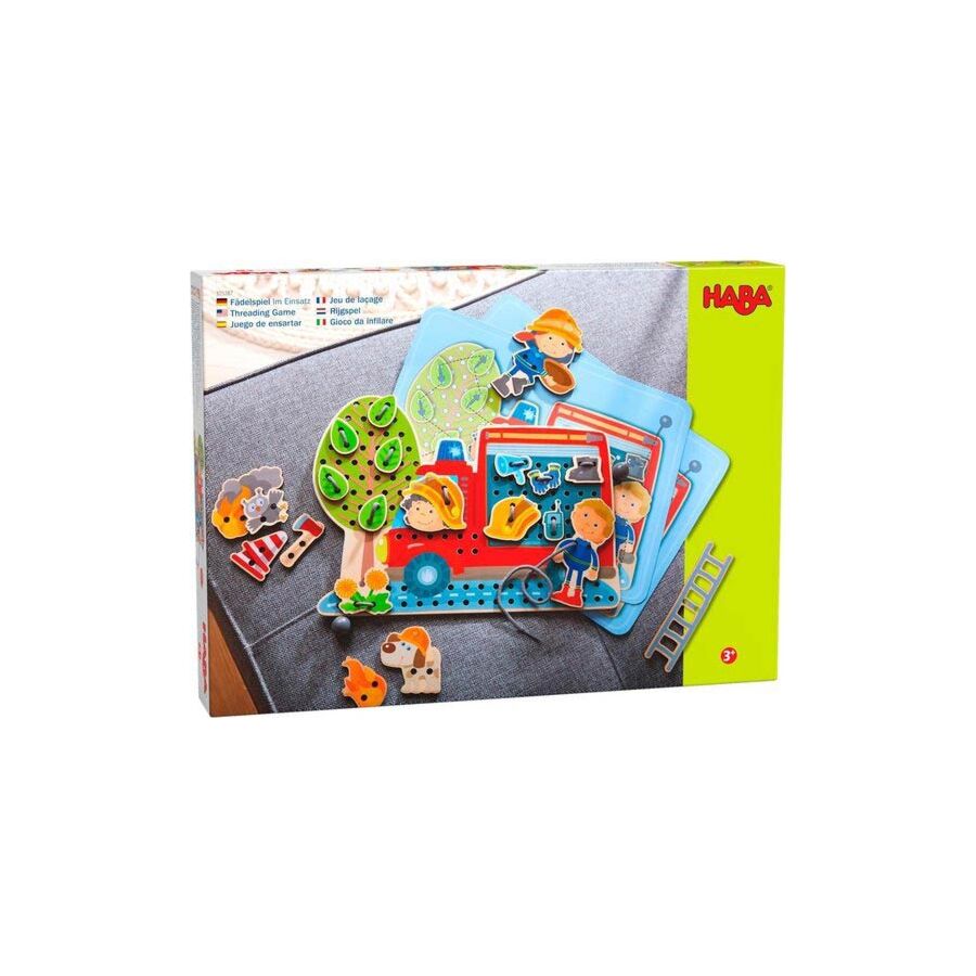 Dit is een rijgspel voor kleine fans van de brandweer. Het rijgbord heeft de vorm van een grote brandweerwagen tegenover een boom. De 38 rijgplaatjes kunnen willekeurig of volgens het voorbeeld geregen worden.