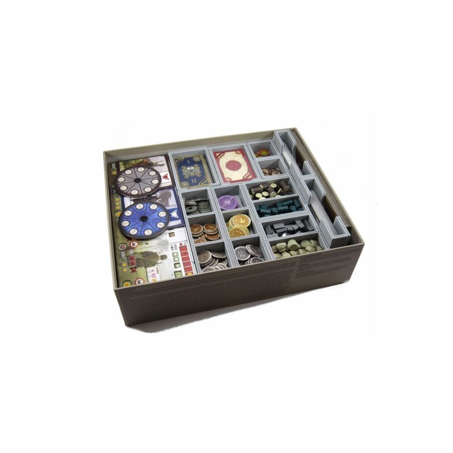 Deze Scythe Insert is van het merk Folded Space en werd gemaakt van gelamineerde Evacore (= traagschuim). De insert is bedoeld voor het spel Scythe en de Afar uitbreiding.