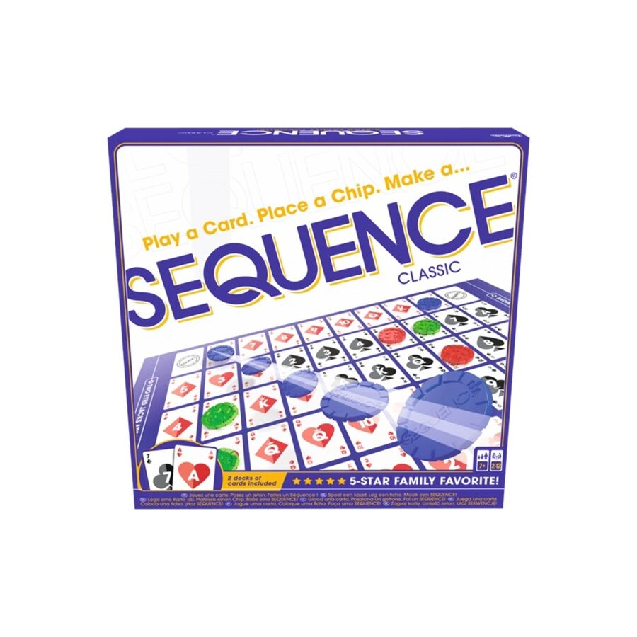Om het bordspel Sequence te winnen moet je als eerste twee rijen van elk 5 fiches van dezelfde kleur achter elkaar hebben. De rijen mogen horizontaal, verticaal en diagonaal zijn. Leg een kaart uit je hand voor je neer en leg een fiche op het bijhorende vakje op het bord. Pas op voor de boeren. Sommigen zijn wild en anderen zijn echte schurken!