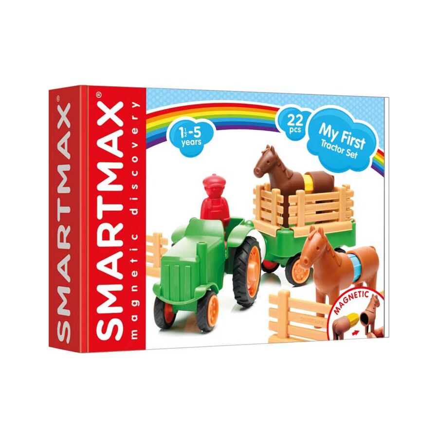 SmartMax My First Tractor is een SmartMax pakket dat bestaat uit 22 onderdelen: 4 staven, 1 bal, 4 dierenstukken, 1 boer en 4 tractorstukken en 8 hekken.