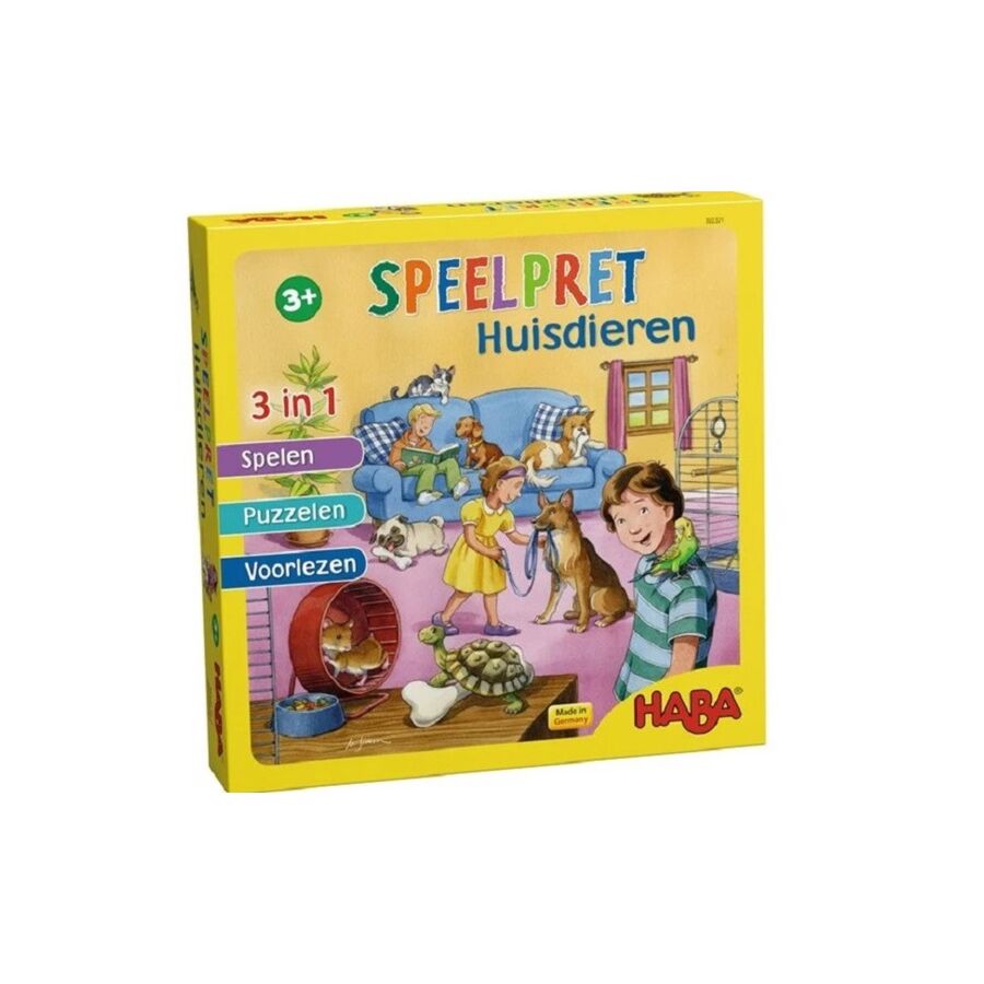 Speelpret Huisdier is een boordevolle doos met drie spellen (een grappig geheugenspel, een beestachtig reactiespel, een leuke loopwedstrijd), drie verhaaltjes om voor te lezen en twee puzzels (12 en 15 stukken).