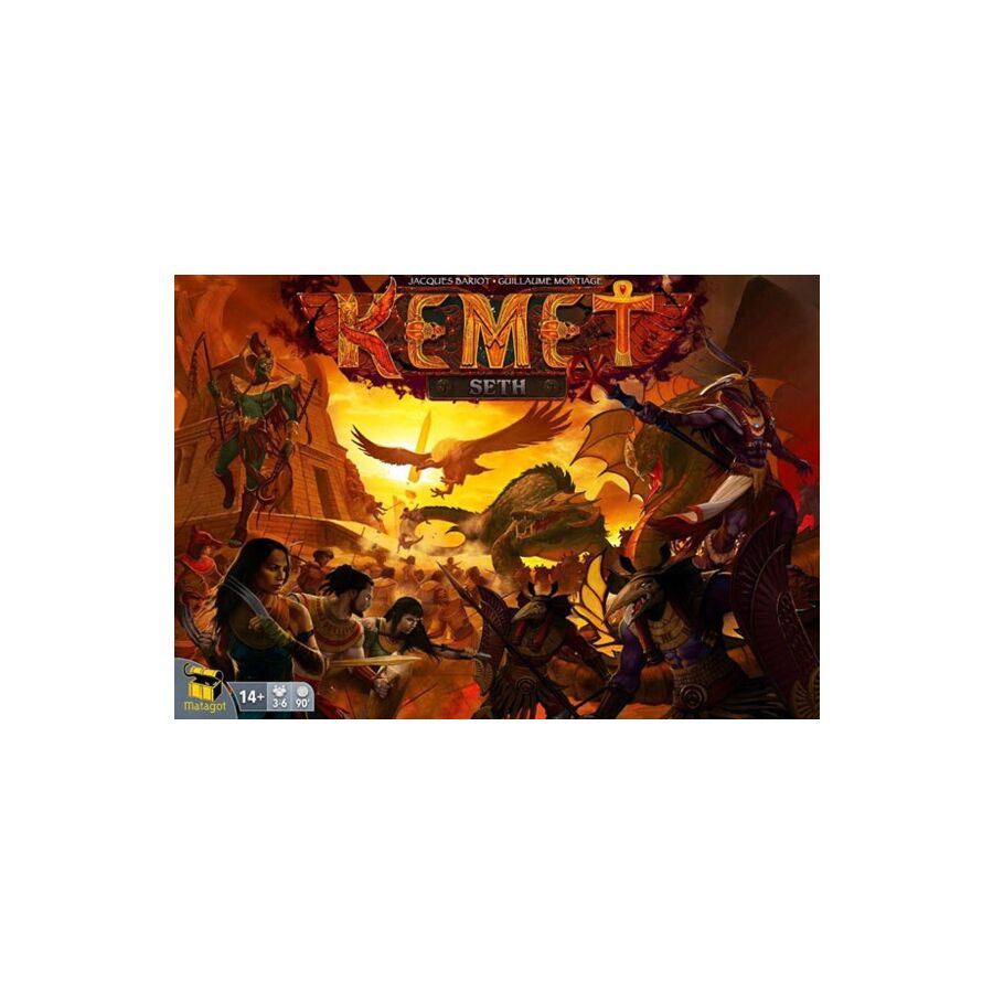 Kemet: Seth allows you to play the game with up to six players in a "one vs. all" version of Kemet, with the "all"co-operating to stop the invasion of Seth, while also needing to resist their powerful powers of corruption. Seth will benefit from his own power tiles, his own board, his own creatures, and his own Divine Intervention cards. The community will be able to count on the powerful Osiris, temples to build, and new rules allowing them to co-operate better by creating, for example, mixed troops.