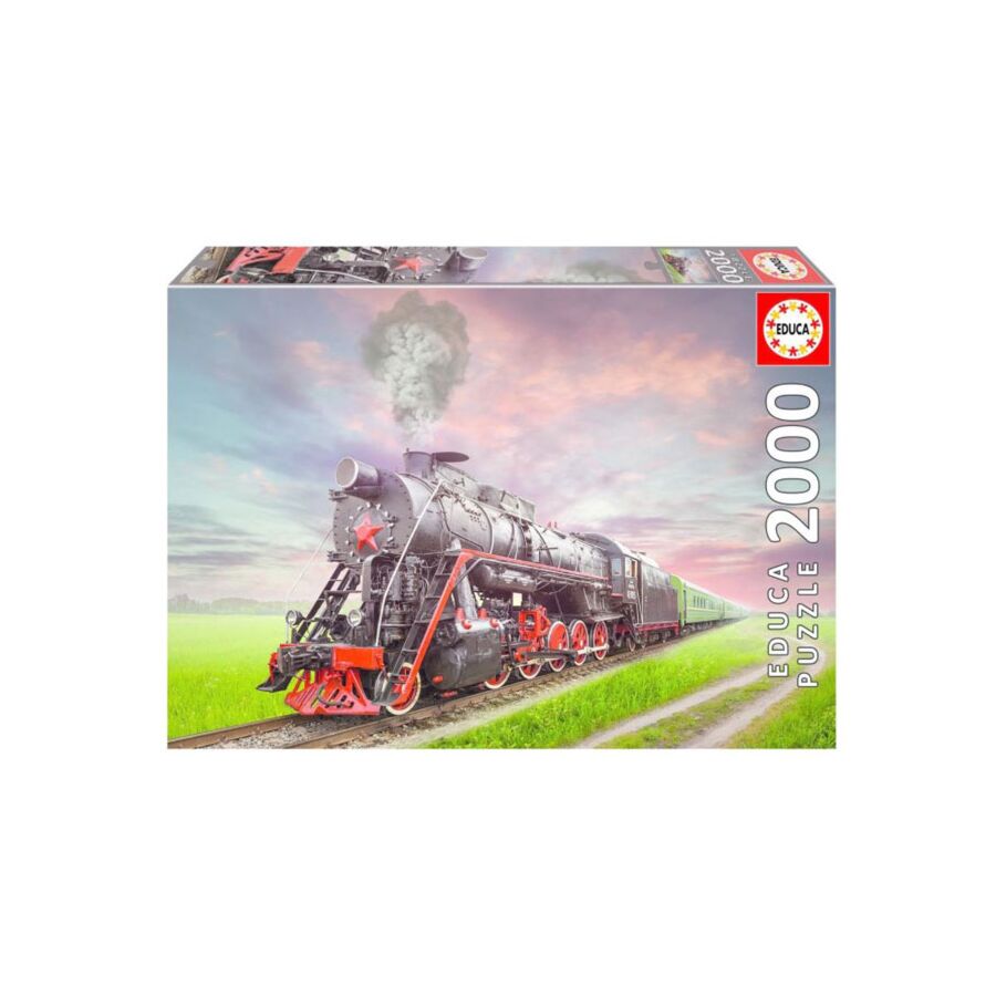 Dit is een legpuzzel van het merk Educa. De puzzel bestaat uit 2000 puzzelstukken en heeft een grootte van 96 x 68 cm. Op de afbeelding zie je een stoomlocomotief rijden door een uitgestrekt grasveld.