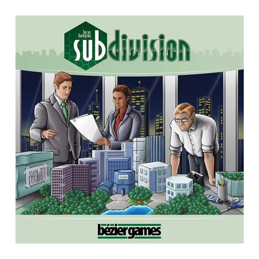 In the game Subdivision each player starts with a subdivision player board and a hand of hex-shaped zone tiles. A parcel die is rolled to indicate the type of parcel where a zone tile may be placed, and all players simultaneously place one of their tiles. If a zone tile is placed next to existing zone tiles, those existing tiles have the ability to create new improvements, which may also be placed at this time. Those improvements provide money and points, while slowly covering up as many parcels as possible. Players pass the remaining zone tiles in hand to their left, then someone rolls the parcel die once again. This continues until only one zone tile remains in hand, which is discarded.