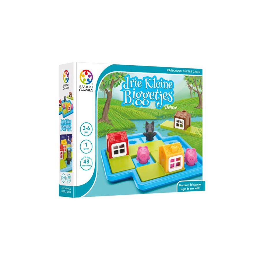 Drie Kleine Biggetjes Deluxe is een smart spel voor kleuters met als thema de biggetjes en de wolf. Er zit ook een prentenboekje (zonder tekst) bij met het verhaal van de Drie Kleine Biggetjes.
