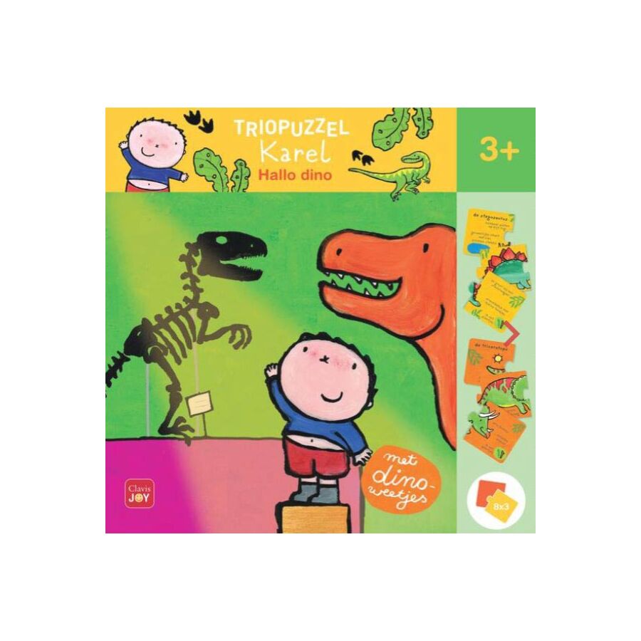 Dit zijn acht leerzame triopuzzels voor kinderen vanaf 3 jaar. Ontdek de wereld van de dino's samen met Karel en zijn vriendjes. Lukt het je om alle stukjes goed te leggen?