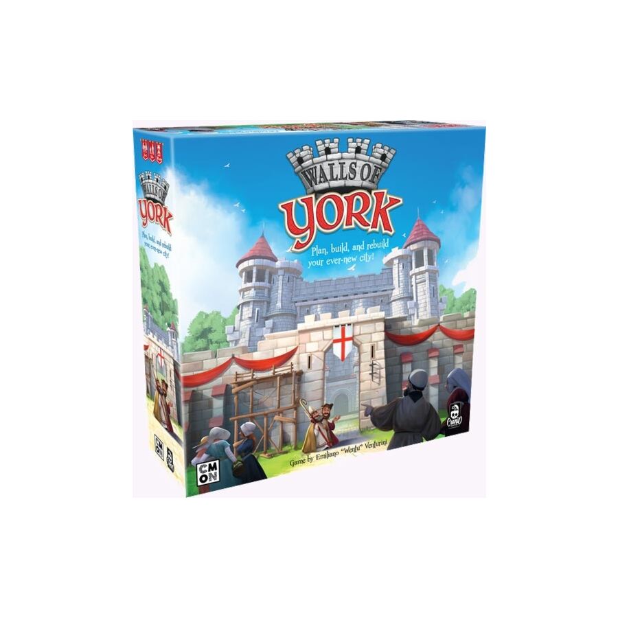 In the game Walls of York, players must use the plastic wall pieces to construct a defensive barrier around the buildings on their city map. Each turn, a player rolls the building die, which dictates which types of walls are to be used. Players must enclose their city, containing the required buildings from the King's decree — but players must beware for the Vikings will come and lay waste at the end of the first age, forcing players to build anew in the second age. The player with the most coins at the end of the second age wins.