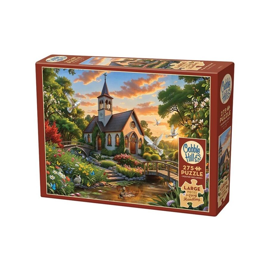 Rondom het kerkje bruist het van het rustige leven. Eenden dobberen op de vijver, duiven fladderen door de lucht en konijntjes rusten tussen de bloemen. Het geheel vormt een serene en sfeervolle scène die perfect is om even helemaal tot rust te komen.