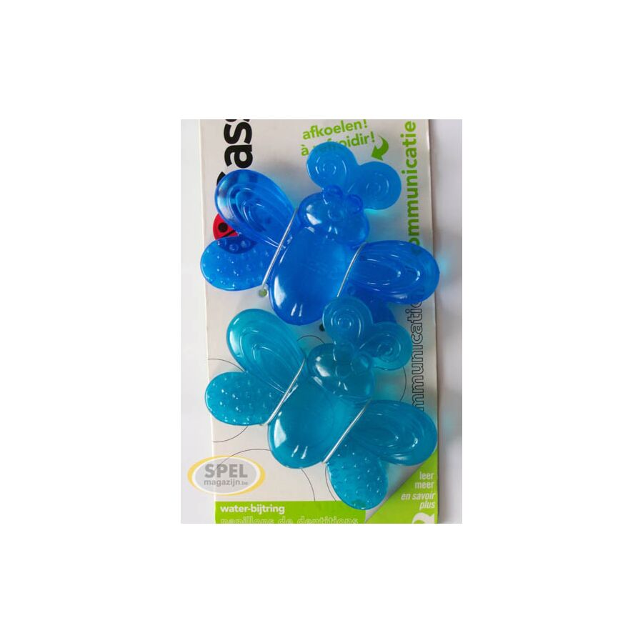 Deze verpakking bestaat uit twee met water gevulde bijtringen in de vorm van een vlinder, een lichte blauwe en een donker blauwe. Sommige delen van de bijtring zijn zacht en sommige zijn hard. Deze afwisseling en het reliëf in het materiaal zorgen voor variatie en verkenningsplezier bij baby. De bijtring kan gekoeld worden in de ijskast om eventuele pijn aan het tandvlees te verzachten.