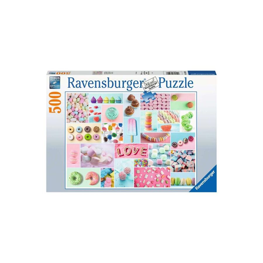 Laat je verleiden door al het lekkers op deze legpuzzel van 500 stukjes met snoep! De kleurrijke compositie van de verschillende snoepjes, cupcakes en donuts zal jou vast doen watertanden.